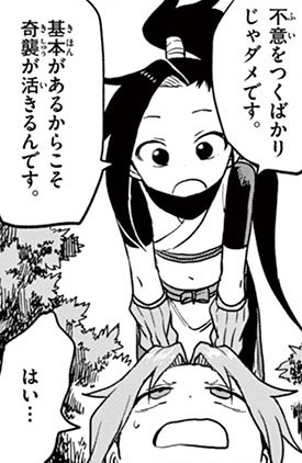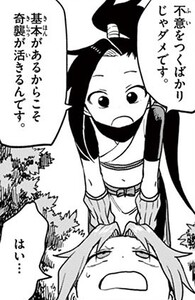 Tsubaki is teaching that being clever or tricky (using surprise attacks) isn’t enough on its own. True skill comes from mastering the basics first, which then make those surprise moves actually work.